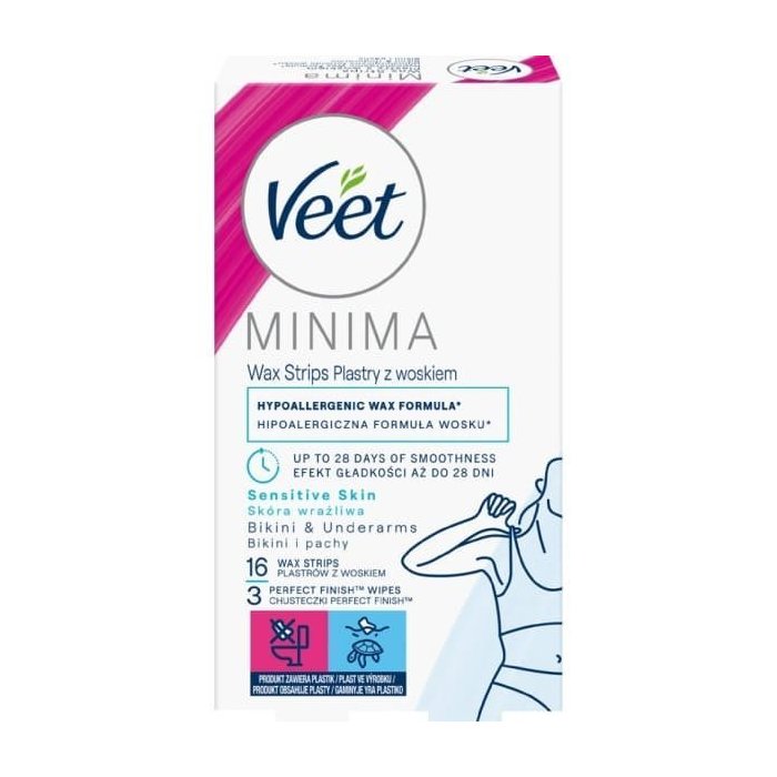 Objavte šetrnú a účinnú starostlivosť o pokožku vďaka Veet Minima voskovým pásikom určeným pre citlivú pokožku. Hypoalergénna formula s minimom ingrediencií bola vyvinutá tak, aby minimalizovala riziko podráždenia a zároveň poskytla dôkladné odstránenie chĺpkov až od korienkov.