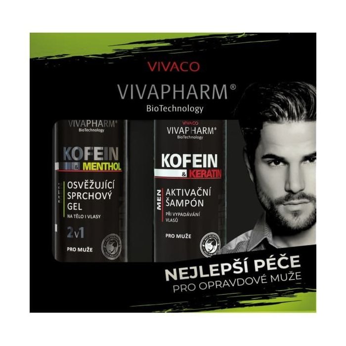 Darčekové balenie kozmetiky pre mužov pre každodennú starostlivosť o telo, vlasy a pleť s kofeínom, keratínom a mehtolom.