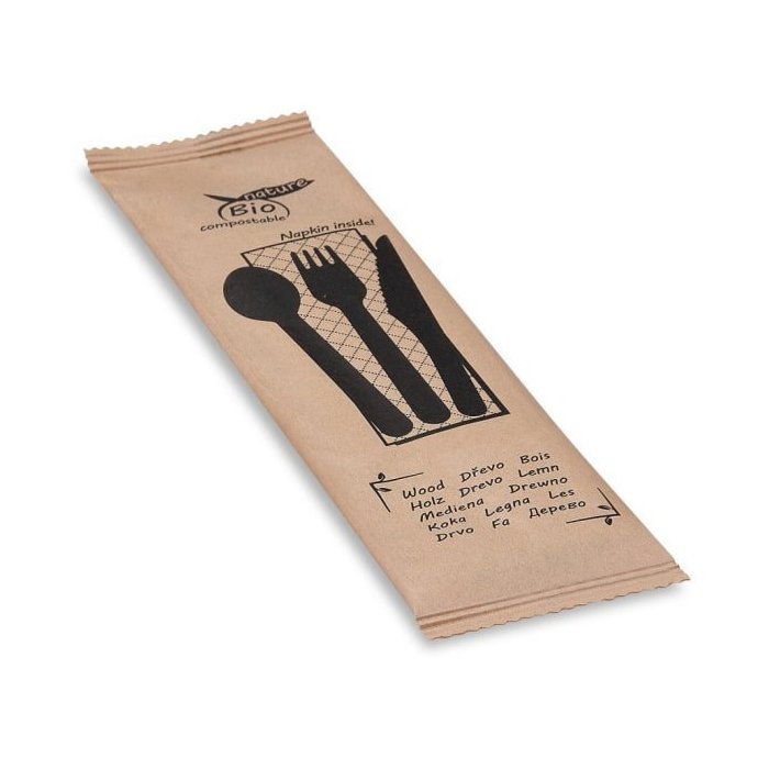Príborová sada vyrobená z dreva v praktickom uzatvorenom papierovom obale.