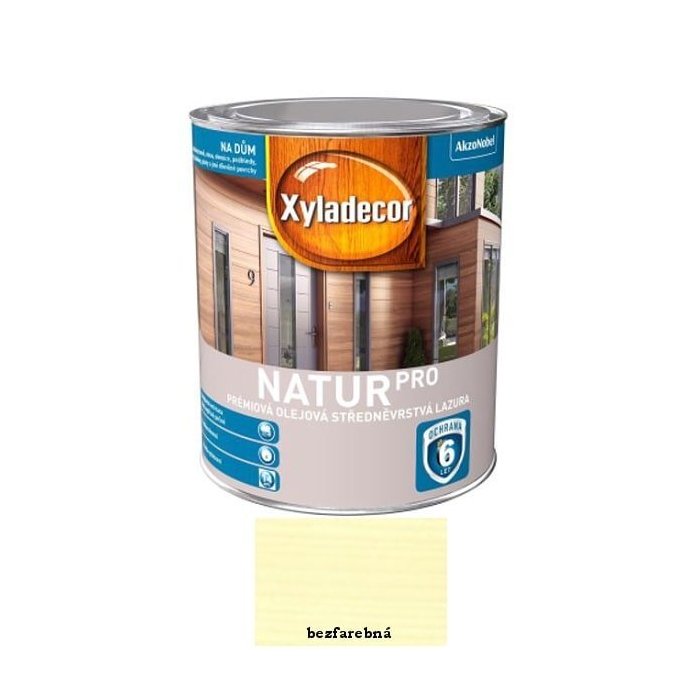 Xyladecor Natur Pro je prémiová olejová strednovrstvová lazúra na vodnej báze na použitie v interiéri i exteriéri. Vytvára silný, elegantne polomatný, saténový film na povrchu dreva, ktorý chráni proti UV žiareniu a nepriazni počasia. Rýchloschnúci. Náter je odolný proti bežným čistiacim prostriedkom v domácnosti. Krémová konzistencia produktu uľahčuje aplikáciu, lepšie sa rozotiera a viac penetruje do dreva. Zvyšuje priľnavosť ďalšieho náteru. Zvýrazňuje štruktúru dreva a nezapácha. Je určený na všetky drevené povrchy, ako sú obklady domov, chaty, altány, pergoly, ploty, balkóny, okná, dvere a iné drevené povrchy v exteriéri aj interiéri.