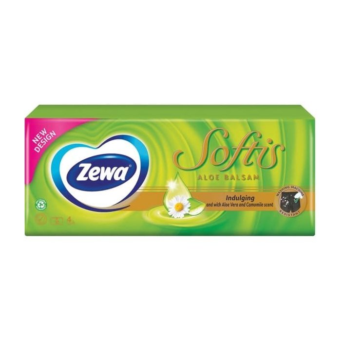 Zewa Softis Aloe Balsam: papierové vreckovky s jemnosťou kamilky a hojivými účinkami aloe vera. Nedráždi nos a nespôsobuje zčervenanie.